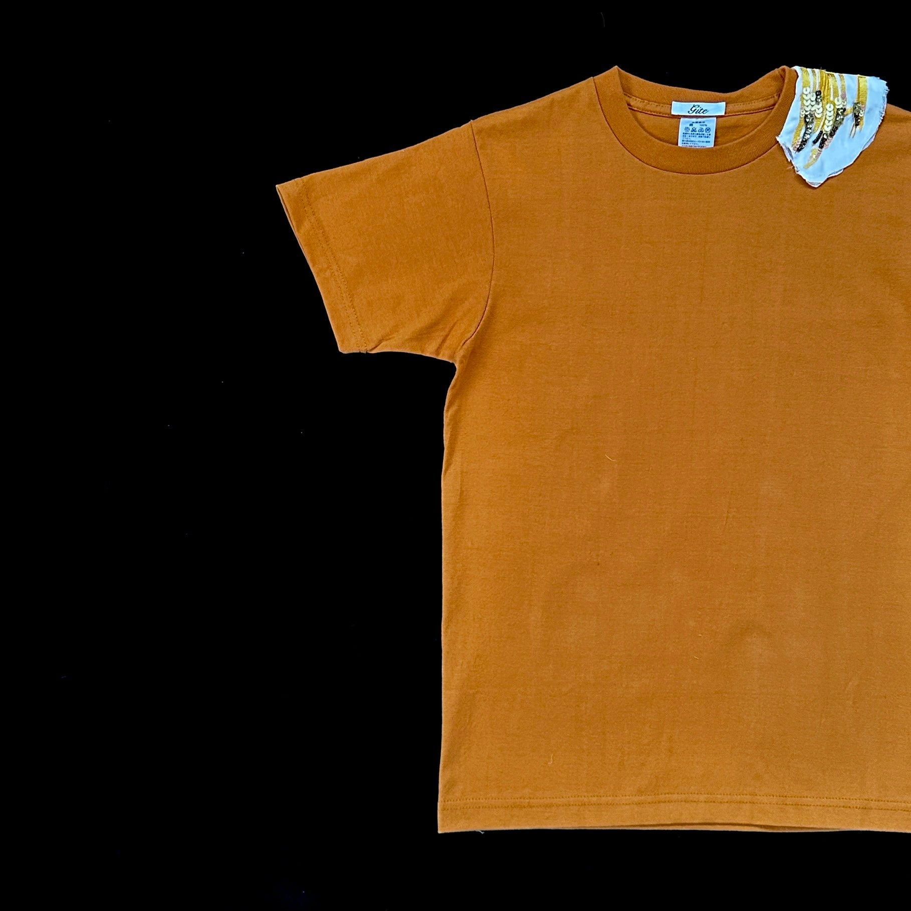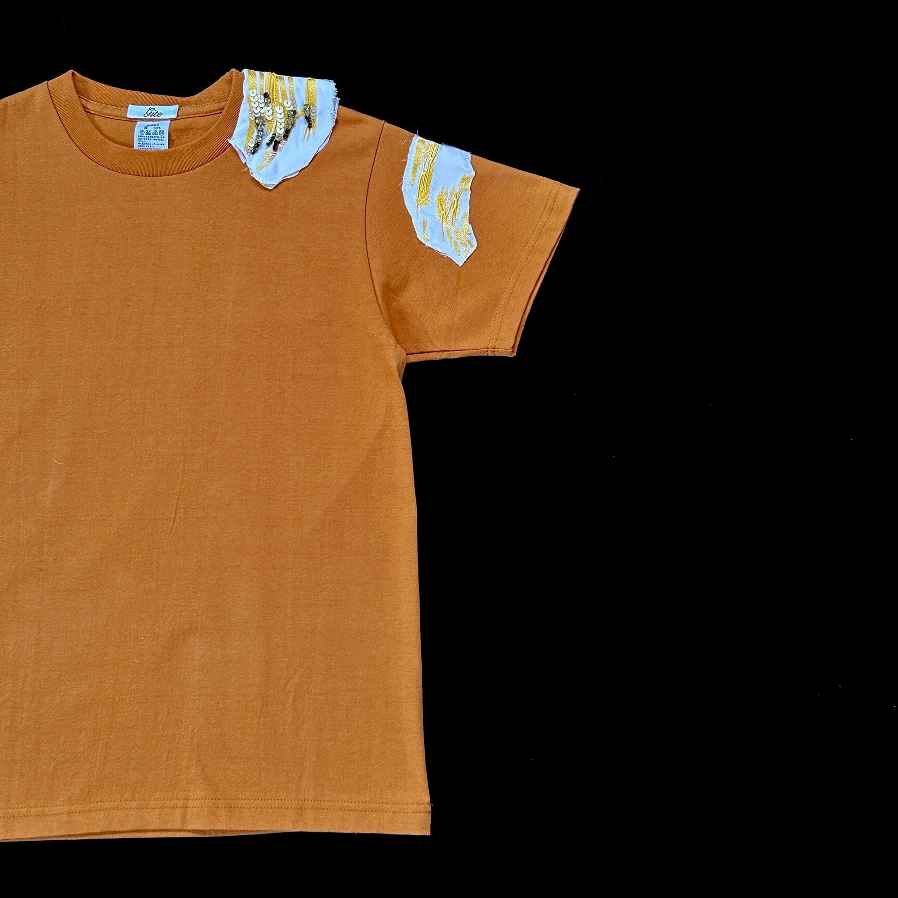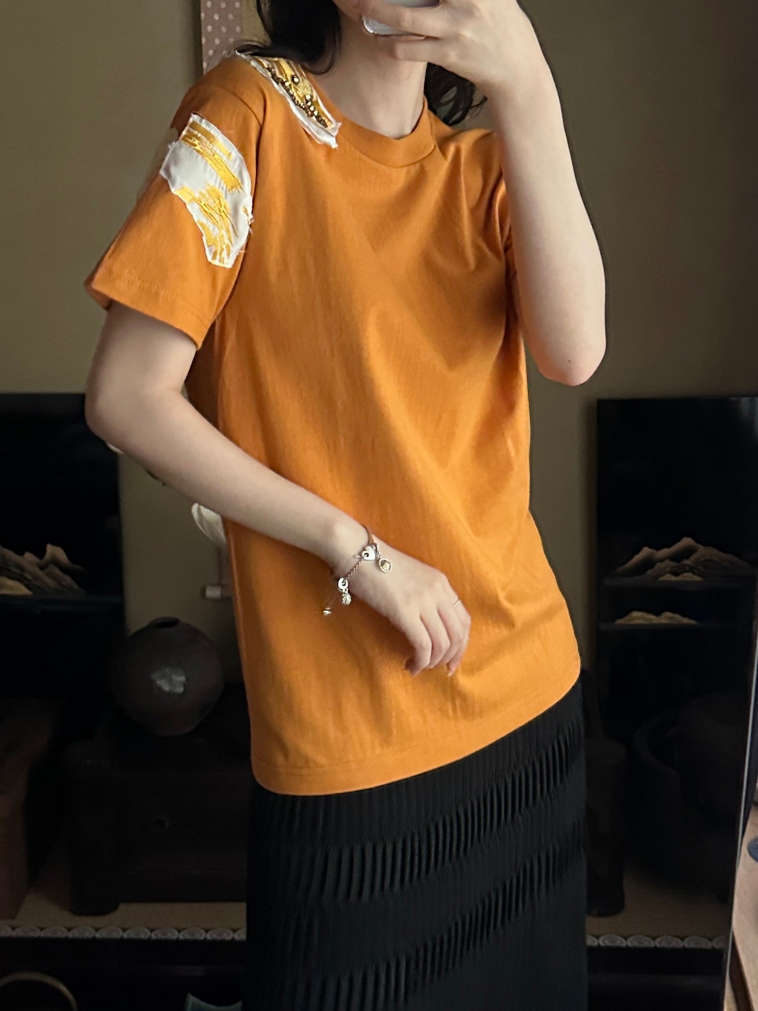 芥子色圆领T, XS码仅一件。拼布为真丝面料,来自和服。